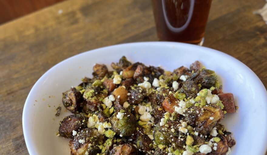 Flash-fried Brussels sprouts tossed in calabrian chiile honey and topped with crispy pork belly, goat cheese, and pistachios
